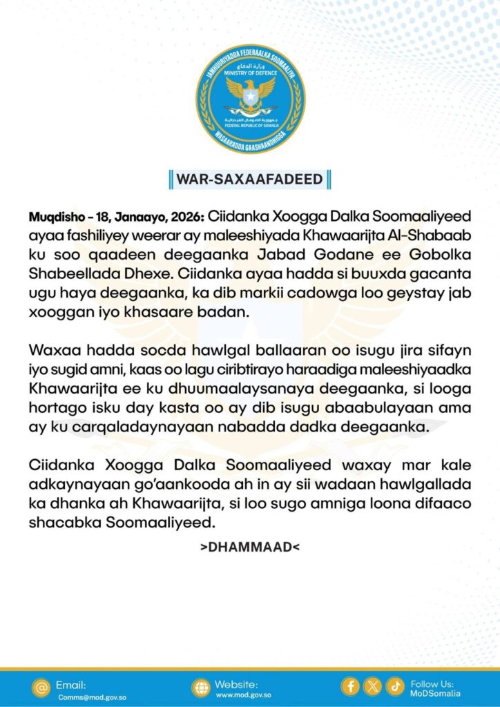 “Ciidanka Xoogga Dalka Soomaaliyeed ayaa fashiliyey weerar ay maleeshiyada Khawaarijta Al-Shabaab ku soo qaadeen deegaanka Jabad Godane ee Gobolka Shabeellada Dhexe. Ciidanka ayaa hadda si buuxda gacanta ugu haya deegaanka, ka dib markii cadowga loo geystay jab xooggan iyo khasaare badan” ayaa lagu yiri qoraalka wasaaradda Gaashaandhigga.