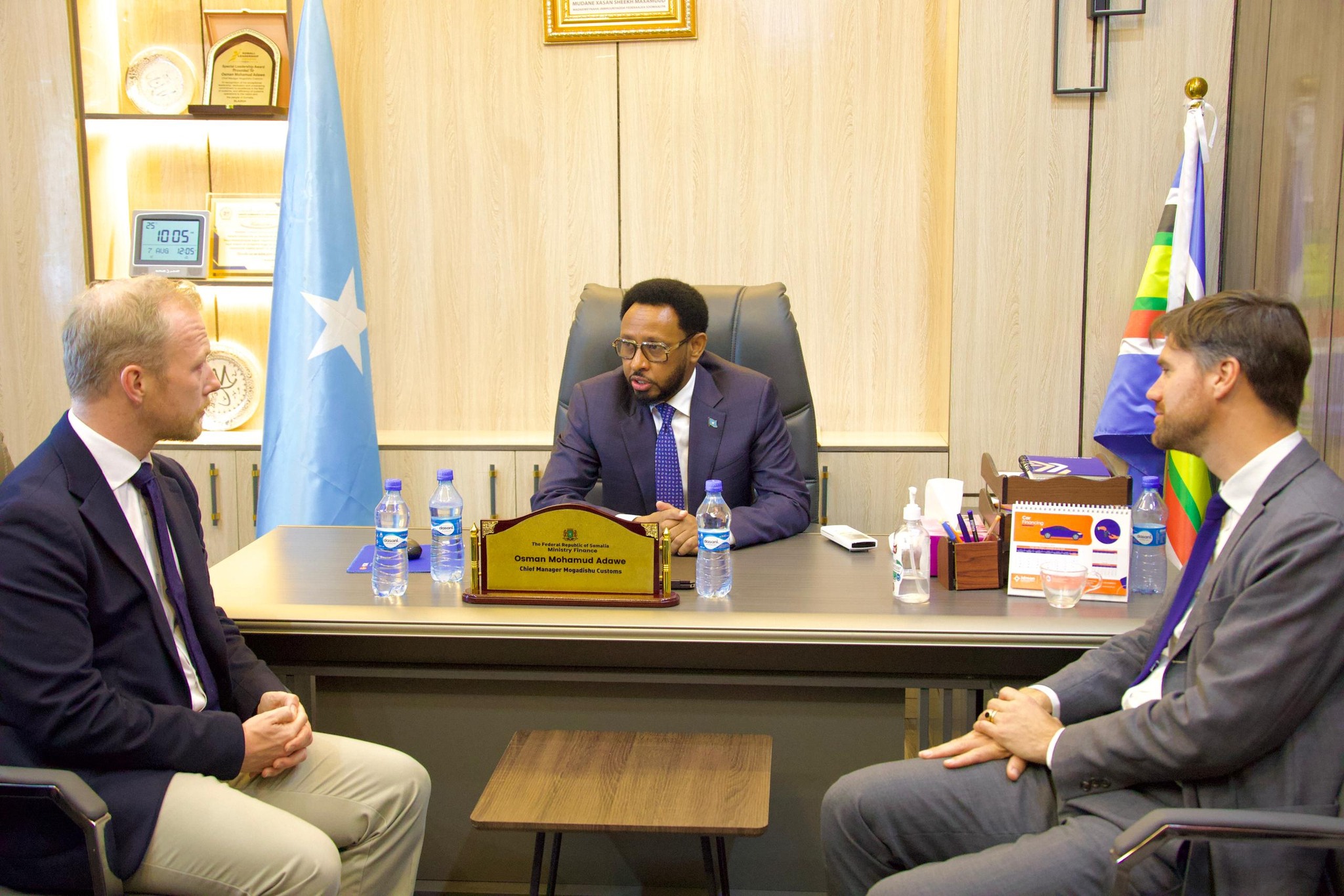 Muqdisho ( Raxanreeb Online) Wasiirka Maaliyadda Xukuumadda Soomaaliya, Biixi Iimaan Cige oo ay weheliyaan Agaasimaha Guud ee Dakhliga, Maamulaha Dekedda Muqdisho iyo Agaasimaha furdooyinka, ayaa maanta xarunta dekedda ku soo dhaweeyay Safiirka Dowladda UK ee Soomaaliya, Mr. Charles King iyo koox ka socotay Xafiiska horumarinta Dowladda UK.