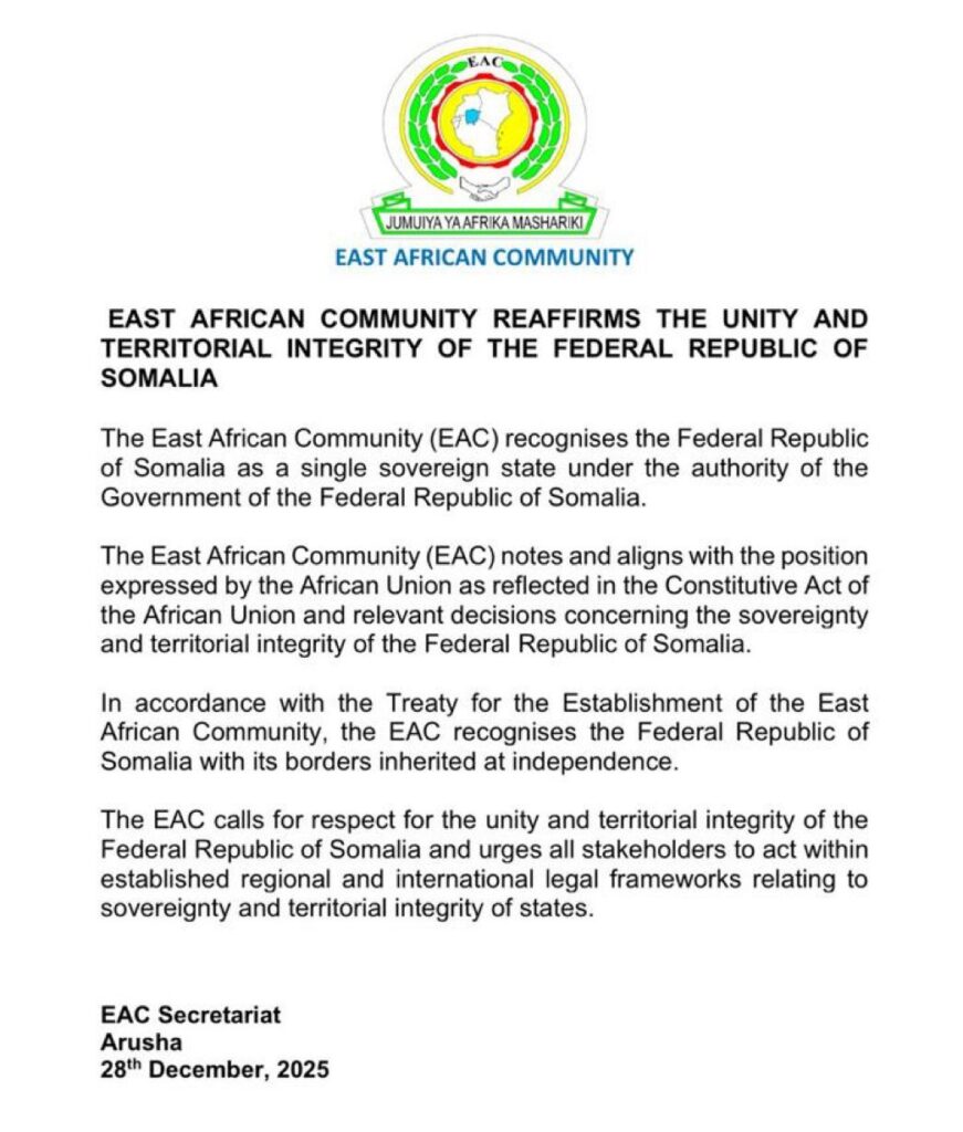 In a statement released on Sunday in Arusha, the EAC noted and aligned with the position expressed by the African Union as reflected in the Constitutive Act of the African Union and relevant decisions concerning the sovereignty and territorial integrity of the Federal Republic of Somalia.