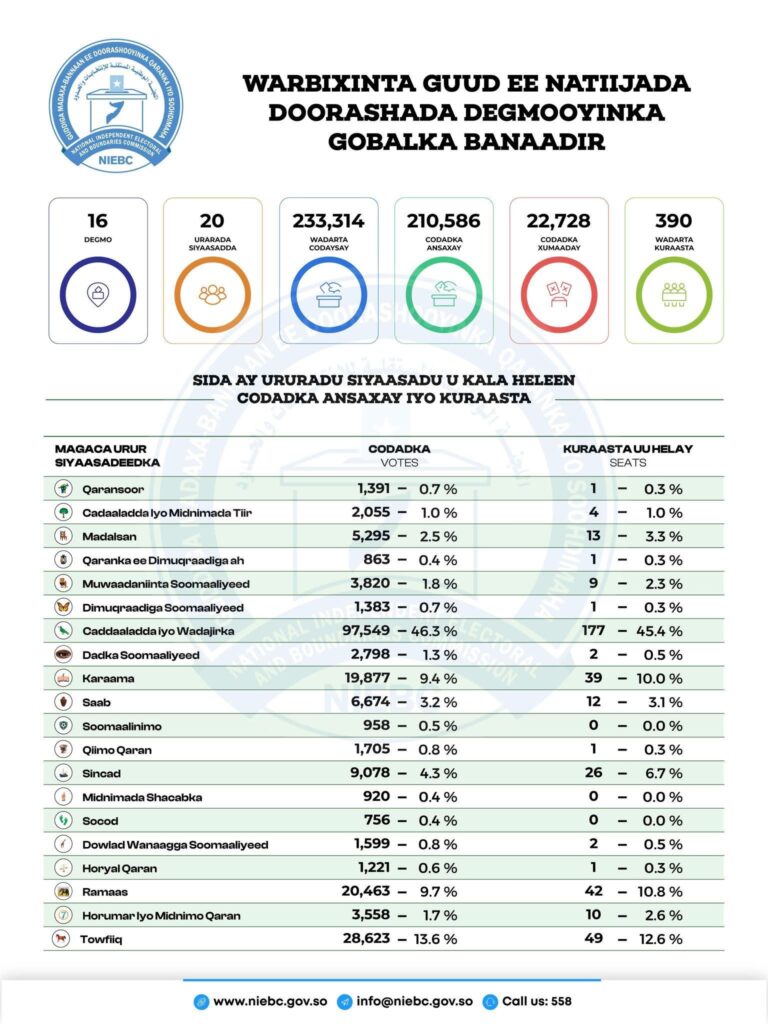 The National Independent Electoral Boundaries Commission of Somalia (NIEBC) has unveiled their first-ever poll results in Banadir in nearly 60 years.