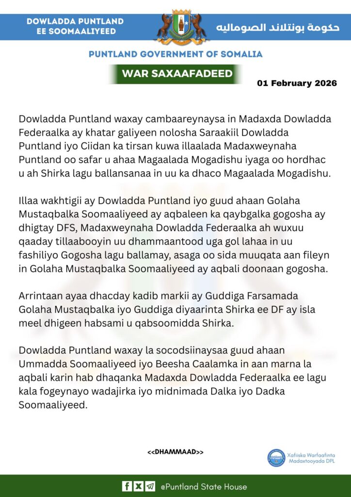 Hoos ka akhriso war-saxafadeedka Puntland.