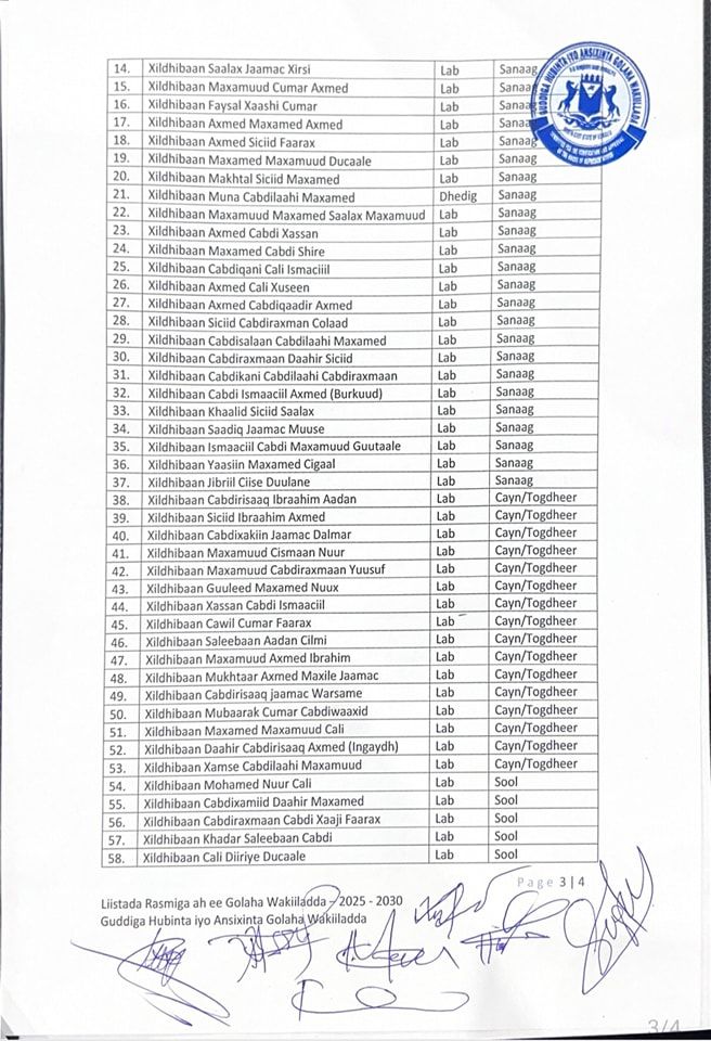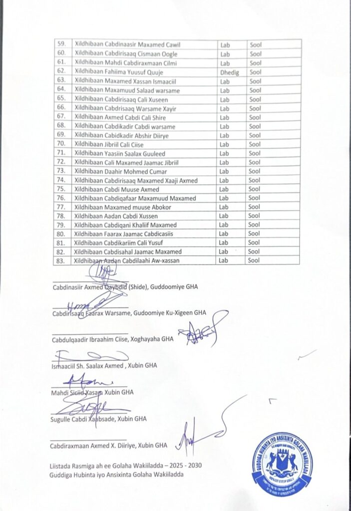 Liiskan oo ka kooban 83 mudane oo loo qeybiyay beelaha degga gobollada maamulkaasi ka taliyo, ayaa waxaa kamid noqday 4 haween ah iyo 79 rag ah.