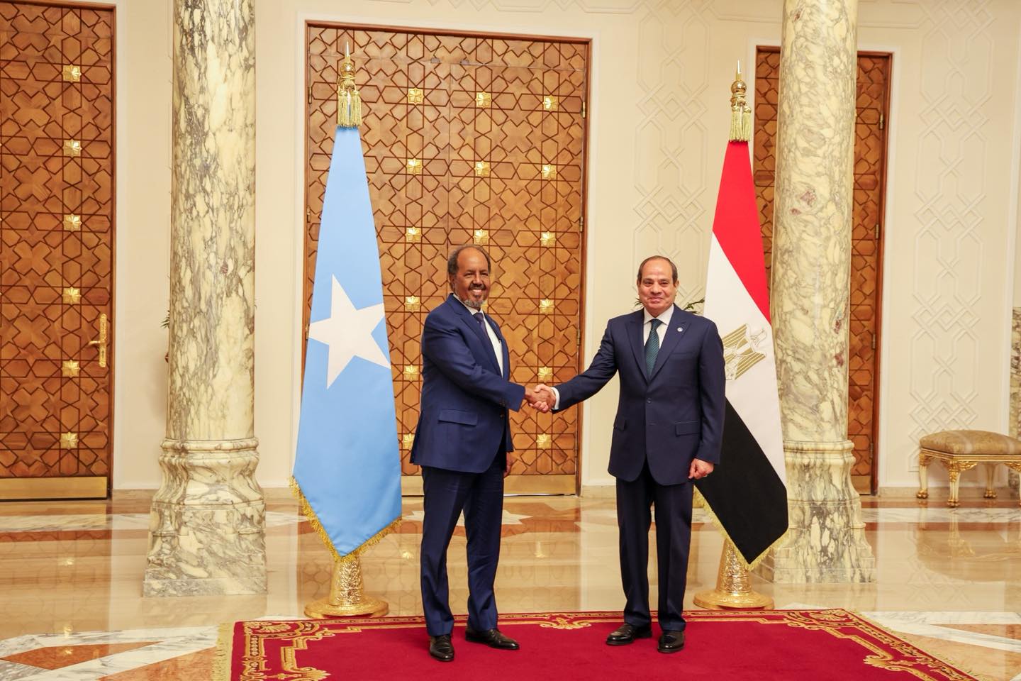 Qaahira ( Raxanreeb Online) Madaxweynaha Soomaaliya Xasan Sheekh Maxamuud ayaa si weyn loogu soo dhoweeyay Qasriga Madaxtooyada Al-Itixaadiya ee magaalada Qaahira ee Caasimadda dalka Masar, halkaasoo uu ku qaabilay dhiggiisa Cabdifataax Al-Sisi.