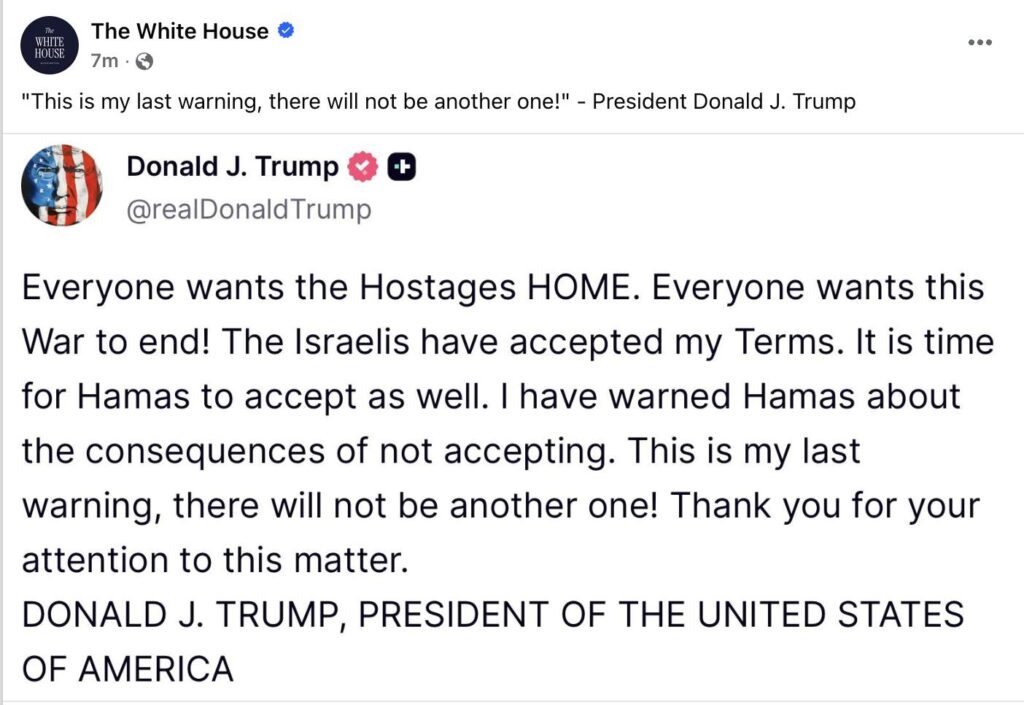 Bayaan ka soo baxay Maraykanka ayaa Donald Trump uu ugu yeedhay digniintii ugu dambaysay ee Xamaas ee ku aaddan in ay aqbasho heshiiska lagu sii daynayo la haystayaasha Israa’iil.