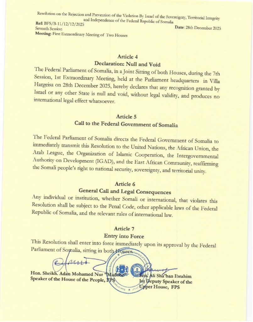Article 4 of the resolution declares any recognition granted by Israel of any other state null and void without any legal validity. Article 6 warned that any individual or institution that violates this resolution will be subject to the Somali penal code and applicable international laws.