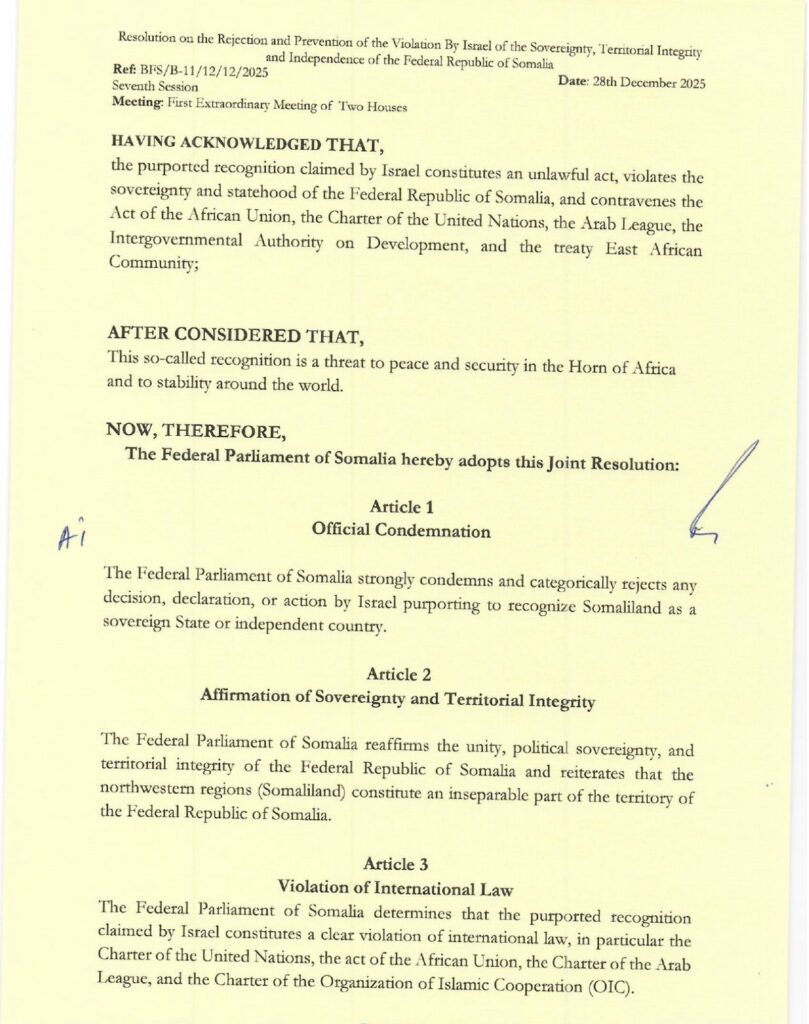 In a special sitting of the two houses, their resolution date of December 28th, 2025, follows Israel’s recognition of the self-declared state of Somaliland. The parliament has branded the act as an unlawful act and a direct violation of Somali national sovereignty.